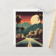 The image depicts a stylized illustration of a scenic Hollywood view. The color palette is warm with a retro vibe, featuring shades of orange, red, yellow, and teal. In the foreground, there's a road that leads towards the horizon, marked with white lines that suggest motion blur, giving a sense of depth and movement.