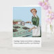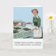 A vintage image of a retro housewife from the 1950s or 1960s. She's standing in front of her turquoise stove, wearing a dress and apron, and holding a small pot over one of the stove burners. She smiles sweetly, turns and says to her husband, "Darling, I know you’d love a relaxing, home cooked meal for your birthday." On the inside of the card: "So I called your mom."