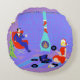 This Retro Home for the Holidays Round Pillow looks like a scene out of a 1960's television Christmas special. The minimalist design features an attractive cartoon couple in the living room of a mid century modern house. The room prominently features a purple and blue stone wall and a matching purple and blue striped rug. Against the wall, there is a turquoise cone shaped fireplace with a roaring fire. Two, red and white Christmas stockings have been hung by the mod chimney with care. Strands of colorful Christmas lights are strung across the top of the wall. In the corner, the suave man of the house is lounging in a red egg chair. He is wearing a blue suit with a red tie. There is a sprig of holly pinned to his lapel. In one hand, he is holding a martini glass. No wonder he's so full of the Christmas spirit! Beside him, there is a small, green Christmas tree with teal ornaments and a yellow star. Hanging from the ceiling, there is a yellow Sputnik light fixture. A blonde with an hourglass figure is sitting on the rug. She is wearing a festive, red dress and Santa hat. Beside her, on the floor, there is a blue and black portable record player. Several Christmas albums are scattered near the beautiful deejay. Go ahead and sing along. You know you want to!