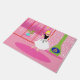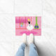 This Retro In the Pink Door Mat looks like a scene out of a 1960's romantic comedy. The minimalist design shows a sophisticated woman in her ultra kitschy and ultra pink, penthouse apartment. The room features a pink brick wall with white grout lines. In front of the wall, there is a green cone fireplace with a roaring fire. Through sliding glass doors we see a pink balcony with a white railing. A lush, tropical plant is in an aqua flowerpot. The view from the balcony is of a silhouette of a big city skyline. Of course, the silhouette is in shades of pink! A yellow, crescent moon is in the sky. Standing on a hot pink, shag rug in the apartment is the leading lady of this design. In stark contrast to the rosy world she has created, the beautiful blonde is wearing a form fitting, black, scoop-necked top with a long, flared, white skirt with black feather embellishments. With this design, you too can be looking at the world through rose colored glasses!