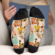 Add a fun and wild touch to any outfit with these patterned socks. This retro style design features cute illustrations of an assortment of jungle animals birds, lions, giraffes, zebra, elephants, crocodiles, snakes, monkeys and more in shades of aqua blue, golden yellow, orange, brown and peach are set against a cream colored background.