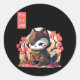 Retro Kawaii Samurai Cat with Cherry Blossom Tree Classic Round Sticker