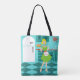 With this Retro Kitchen All-Over Print Tote Bag, you can have your pie and eat it, too. This kitschy, minimalist art drawing features a perfect 1950's housewife, in her mid century modern kitchen. The beautiful baker is wearing a flouncy, green dress and a white apron with red detailing. Not a hair on her blonde head is out of place. In one hand, she is holding the fruit of her labor--a gorgeous, lattice topped, fruit pie. One glance and you'll know that her flaky pie crusts are second to none. She is standing on an aqua and teal checkerboard floor, which is undoubtedly clean enough to eat off of. Against an aqua wall, we see teal cabinetry with aqua trim work, a red countertop, red drawer pulls, and black starburst accents. A red, starburst clock is hanging on the wall. To the side, there is a state of the art, white refrigerator with silver handles. At least, the fridge was state of the art in 1950's. Now, it's just plain dreamy! Whether you're Suzie Homemaker or simply have an affinity for all things vintage, you're sure to love this scrumptious slice of Americana.