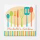 A collection of fun, retro styled cooking and eating utensil decorates this personalized kitchen magnet. In classic shades of teal, lime, and orange. More color schemes available: