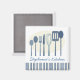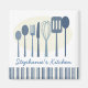 A collection of fun, retro styled cooking and eating utensil decorates this personalized kitchen magnet. In pretty shades of blues on a white background. More color schemes available: