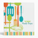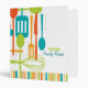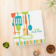 Retro style implements for cooking and eating are featured on this cool recipe binder in classic shades of brown, teal, lime and orange on a crisp white background. Customize the two lines of text on the cover with your family name or message.