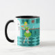 With this Retro Kitchen Mug, you can have your pie and eat it, too. This kitschy, minimalist art drawing features a perfect 1950's housewife, in her mid century modern kitchen. The beautiful baker is wearing a flouncy, green dress and a white apron with red detailing. Not a hair on her blonde head is out of place. In one hand, she is holding the fruit of her labor--a gorgeous, lattice topped, fruit pie. One glance and you'll know that her flaky pie crusts are second to none. She is standing on an aqua and teal checkerboard floor, which is undoubtedly clean enough to eat off of. Against an aqua wall, we see teal cabinetry with aqua trim work, a red countertop, red drawer pulls, and black starburst accents. A red, starburst clock is hanging on the wall. To the side, there is a state of the art, white refrigerator with silver handles. At least, the fridge was state of the art in 1950's. Now, it's just plain dreamy! Whether you're Suzie Homemaker or simply have an affinity for all things vintage, you're sure to love this scrumptious slice of Americana.