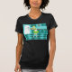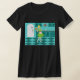 With this Retro Kitchen T-Shirt, you can have your pie and eat it, too. This kitschy, minimalist art drawing features a perfect 1950's housewife, in her mid century modern kitchen. The beautiful baker is wearing a flouncy, green dress and a white apron with red detailing. Not a hair on her blonde head is out of place. In one hand, she is holding the fruit of her labor--a gorgeous, lattice topped, fruit pie. One glance and you'll know that her flaky pie crusts are second to none. She is standing on an aqua and teal checkerboard floor, which is undoubtedly clean enough to eat off of. Against an aqua wall, we see teal cabinetry with aqua trim work, a red countertop, red drawer pulls, and black starburst accents. A red, starburst clock is hanging on the wall. To the side, there is a state of the art, white refrigerator with silver handles. At least, the fridge was state of the art in 1950's. Now, it's just plain dreamy! Whether you're Suzie Homemaker or simply have an affinity for all things vintage, you're sure to love this scrumptious slice of Americana.