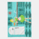With these Retro Kitchen Towels, you can have your pie and eat it, too. This kitschy, minimalist art drawing features a perfect 1950's housewife, in her mid century modern kitchen. The beautiful baker is wearing a flouncy, green dress and a white apron with red detailing. Not a hair on her blonde head is out of place. In one hand, she is holding the fruit of her labor--a gorgeous, lattice topped, fruit pie. One glance and you'll know that her flaky pie crusts are second to none. She is standing on an aqua and teal checkerboard floor, which is undoubtedly clean enough to eat off of. Against an aqua wall, we see teal cabinetry with aqua trim work, a red countertop, red drawer pulls, and black starburst accents. A red, starburst clock is hanging on the wall. To the side, there is a state of the art, white refrigerator with silver handles. At least, the fridge was state of the art in 1950's. Now, it's just plain dreamy! Whether you're Suzie Homemaker or simply have an affinity for all things vintage, you're sure to love this scrumptious slice of Americana.