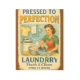 This metal sign features a vintage/retro-inspired image of a lady pressing clothes with her iron. The background of the image showcases a lively laundry room. Hang this tin sign in your laundry room, and it will add retro ambiance. A metal sign like this would also be a thoughtful new home gift for her.