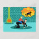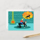Yeehaw! You'll be ready to ride off into the sunset with this Retro Little Cowboy Postcard. This whimsical design features a vibrant, 1960's style, minimalist, cartoon drawing of a father and his young son having rip-roaring, good time. The scene takes place in their mid century modern living room, which has an aqua floor and a wall of teal and aqua bricks. The rowdy youngster is wearing a red shirt, blue jeans, and brown cowboy boots. That's the perfect attire for getting a make believe horsey back ride from his indulgent father. Dad appears to have just arrived home after a long day at the office. He is wearing a black suit, white dress shirt, and red tie. He still has the energy to crawl around the room on all fours, while his favorite blond cowboy enjoys riding the range. But the young cowpoke has his mind on another time and place. With the help of a thought bubble, we can see exactly what is on Junior's mind. He is envisioning himself riding through a yellow and orange desert on a sleek, black stallion. The cowboy of his mind is wearing a brown cowboy had to protect him from the searing sun. Behind him is a green cactus, which is eerily reminiscent of the green cone fireplace back in his own family home. I imagine that both horse and rider are working up a real appetite for dinner at a chuck wagon. Where is Mom with that dinner bell?