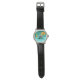 Yeehaw! You'll be ready to ride off into the sunset with this Retro Little Cowboy Watch. This whimsical design features a vibrant, 1960's style, minimalist, cartoon drawing of a father and his young son having rip-roaring, good time. The scene takes place in their mid century modern living room, which has an aqua floor and a wall of teal and aqua bricks. The rowdy youngster is wearing a red shirt, blue jeans, and brown cowboy boots. That's the perfect attire for getting a make believe horsey back ride from his indulgent father. Dad appears to have just arrived home after a long day at the office. He is wearing a black suit, white dress shirt, and red tie. He still has the energy to crawl around the room on all fours, while his favorite blond cowboy enjoys riding the range. But the young cowpoke has his mind on another time and place. With the help of a thought bubble, we can see exactly what is on Junior's mind. He is envisioning himself riding through a yellow and orange desert on a sleek, black stallion. The cowboy of his mind is wearing a brown cowboy had to protect him from the searing sun. Behind him is a green cactus, which is eerily reminiscent of the green cone fireplace back in his own family home. I imagine that both horse and rider are working up a real appetite for dinner at a chuck wagon. Where is Mom with that dinner bell?