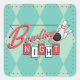 Bowling Night Stickers features the typography "Bowling Night" in a retro, modern 50's style logo, with illustrated bowling ball and pins. Incorporating elements of blue, red, white, and grey, dots, and a diamond patterned background.