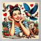 Retro-style illustration featuring a young woman daydreaming of love. She is smiling with her hands resting under her chin. Surrounding her are various flowers, colorful birds in flight, and red hearts.