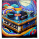 A colorful illustration of an old LP Record player floating in the sky on bubbles.