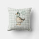 This retro-inspired throw pillow features an adorable duck dressed in a party hat and bow tie, holding a whimsical balloon. The soft sage-green gingham background adds a cozy, rustic look.