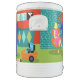This Retro Martini Couple Igloo Beverage Cooler looks like a scene out of a romantic comedy. The setting of this 1960's style, minimalist art design is an elegantly decorated, mid century modern house or apartment. The cast is an attractive couple enjoying an evening filled with sparkling conversation, good music and bottomless drinks. The room features a green floor, and an aqua and teal brick wall. Resting comfortably in a mod, orange egg chair is a beautiful woman. Her bright pink dress is just short enough to show off her shapely gams. With the wave of a hand, this blonde beauty has the immediate attention of her male admirer. Her fair haired companion is wearing a blue suit, white shirt and black bow tie. In his hands, he is holding two, crystal martini glasses with floating olives. Don't worry. He's offering one to his lady friend. The pair is having such a delightful time that neither is taking notice of the hour showing on the kitschy, red, starburst clock on the brick wall behind them. On a recessed fiery red wall, there are three Classic Movie Martini Stretched Canvas Prints, also available from StrangeLittleOnion's Zazzle store (hint, hint!) Two of the prints feature turquoise backgrounds and one is on a dramatic black background. Centered beneath the prints is an elegant wet bar. The front of the teal bar has three harlequin diamonds, in shades of orange, turquoise and green. We can see the silhouettes of martini glasses resting on the counter top. Across the room, an orange ottoman is holding a blue and black, portable record player. On the floor, we see the vinyl records and a bright yellow album cover. This attractive duo is having such a delightful time that neither is taking notice of the hour showing on the kitschy, red, starburst clock on the brick wall behind them.