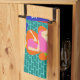 These Retro Martini Couple Kitchen Towels look like a scene out of a romantic comedy. The setting of this 1960's style, minimalist art design is an elegantly decorated, mid century modern house or apartment. The cast is an attractive couple enjoying an evening filled with sparkling conversation, good music and bottomless drinks. The room features a green floor, and an aqua and teal brick wall. Resting comfortably in a mod, orange egg chair is a beautiful woman. Her bright pink dress is just short enough to show off her shapely gams. With the wave of a hand, this blonde beauty has the immediate attention of her male admirer. Her fair haired companion is wearing a blue suit, white shirt and black bow tie. In his hands, he is holding two, crystal martini glasses with floating olives. Don't worry. He's offering one to his lady friend. The pair is having such a delightful time that neither is taking notice of the hour showing on the kitschy, red, starburst clock on the brick wall behind them. On a recessed fiery red wall, there are three Classic Movie Martini Stretched Canvas Prints, also available from StrangeLittleOnion's Zazzle store (hint, hint!) Two of the prints feature turquoise backgrounds and one is on a dramatic black background. Centered beneath the prints is an elegant wet bar. The front of the teal bar has three harlequin diamonds, in shades of orange, turquoise and green. We can see the silhouettes of martini glasses resting on the counter top. Across the room, an orange ottoman is holding a blue and black, portable record player. On the floor, we see the vinyl records and a bright yellow album cover. This attractive duo is having such a delightful time that neither is taking notice of the hour showing on the kitschy, red, starburst clock on the brick wall behind them.