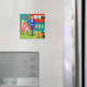 This Retro Martini Couple Magnet looks like a scene out of a romantic comedy. The setting of this 1960's style, minimalist art design is an elegantly decorated, mid century modern house or apartment. The cast is an attractive couple enjoying an evening filled with sparkling conversation, good music and bottomless drinks. The room features a green floor, and an aqua and teal brick wall. Resting comfortably in a mod, orange egg chair is a beautiful woman. Her bright pink dress is just short enough to show off her shapely gams. With the wave of a hand, this blonde beauty has the immediate attention of her male admirer. Her fair haired companion is wearing a blue suit, white shirt and black bow tie. In his hands, he is holding two, crystal martini glasses with floating olives. Don't worry. He's offering one to his lady friend. The pair is having such a delightful time that neither is taking notice of the hour showing on the kitschy, red, starburst clock on the brick wall behind them. On a recessed fiery red wall, there are three Classic Movie Martini Stretched Canvas Prints, also available from StrangeLittleOnion's Zazzle store (hint, hint!) Two of the prints feature turquoise backgrounds and one is on a dramatic black background. Centered beneath the prints is an elegant wet bar. The front of the teal bar has three harlequin diamonds, in shades of orange, turquoise and green. We can see the silhouettes of martini glasses resting on the counter top. Across the room, an orange ottoman is holding a blue and black, portable record player. On the floor, we see the vinyl records and a bright yellow album cover. This attractive duo is having such a delightful time that neither is taking notice of the hour showing on the kitschy, red, starburst clock on the brick wall behind them.