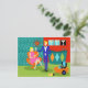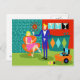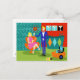 This Retro Martini Couple Postcard looks like a scene out of a romantic comedy. The setting of this 1960's style, minimalist art design is an elegantly decorated, mid century modern house or apartment. The cast is an attractive couple enjoying an evening filled with sparkling conversation, good music and bottomless drinks. The room features a green floor, and an aqua and teal brick wall. Resting comfortably in a mod, orange egg chair is a beautiful woman. Her bright pink dress is just short enough to show off her shapely gams. With the wave of a hand, this blonde beauty has the immediate attention of her male admirer. Her fair haired companion is wearing a blue suit, white shirt and black bow tie. In his hands, he is holding two, crystal martini glasses with floating olives. Don't worry. He's offering one to his lady friend. The pair is having such a delightful time that neither is taking notice of the hour showing on the kitschy, red, starburst clock on the brick wall behind them. On a recessed fiery red wall, there are three Classic Movie Martini Stretched Canvas Prints, also available from StrangeLittleOnion's Zazzle store (hint, hint!) Two of the prints feature turquoise backgrounds and one is on a dramatic black background. Centered beneath the prints is an elegant wet bar. The front of the teal bar has three harlequin diamonds, in shades of orange, turquoise and green. We can see the silhouettes of martini glasses resting on the counter top. Across the room, an orange ottoman is holding a blue and black, portable record player. On the floor, we see the vinyl records and a bright yellow album cover. This attractive duo is having such a delightful time that neither is taking notice of the hour showing on the kitschy, red, starburst clock on the brick wall behind them.