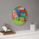 This Retro Martini Couple Round Acrylic Wall Clock looks like a scene out of a romantic comedy. The setting of this 1960's style, minimalist art design is an elegantly decorated, mid century modern house or apartment. The cast is an attractive couple enjoying an evening filled with sparkling conversation, good music and bottomless drinks. The room features a green floor, and an aqua and teal brick wall. Resting comfortably in a mod, orange egg chair is a beautiful woman. Her bright pink dress is just short enough to show off her shapely gams. With the wave of a hand, this blond beauty has the immediate attention of her male admirer. Her fair haired companion is wearing a blue suit, white shirt and black bow tie. In his hands, he is holding two, crystal martini glasses with floating olives. Don't worry. He's offering one to his lady friend. The pair is having such a delightful time that neither is taking notice of the hour showing on the kitschy, red, starburst clock on the brick wall behind them. On a recessed fiery red wall, there are three Classic Movie Martini Stretched Canvas Prints, also available from StrangeLittleOnion's Zazzle store (hint, hint!) Two of the prints feature turquoise backgrounds and one is on a dramatic black background. Centered beneath the prints is an elegant wet bar. The front of the teal bar has three harlequin diamonds, in shades of orange, turquoise and green. We can see the silhouettes of martini glasses resting on the counter top. Across the room, an orange ottoman is holding a blue and black, portable record player. On the floor, we see the vinyl records and a bright yellow album cover. This attractive duo is having such a delightful time that neither is taking notice of the hour showing on the kitschy, red, starburst clock on the brick wall behind them.