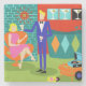 This Retro Martini Couple Stone Coaster looks like a scene out of a romantic comedy. The setting of this 1960's style, minimalist art design is an elegantly decorated, mid century modern house or apartment. The cast is an attractive couple enjoying an evening filled with sparkling conversation, good music and bottomless drinks. The room features a green floor, and an aqua and teal brick wall. Resting comfortably in a mod, orange egg chair is a beautiful woman. Her bright pink dress is just short enough to show off her shapely gams. With the wave of a hand, this blonde beauty has the immediate attention of her male admirer. Her fair haired companion is wearing a blue suit, white shirt and black bow tie. In his hands, he is holding two, crystal martini glasses with floating olives. Don't worry. He's offering one to his lady friend. The pair is having such a delightful time that neither is taking notice of the hour showing on the kitschy, red, starburst clock on the brick wall behind them. On a recessed fiery red wall, there are three Classic Movie Martini Stretched Canvas Prints, also available from StrangeLittleOnion's Zazzle store (hint, hint!) Two of the prints feature turquoise backgrounds and one is on a dramatic black background. Centered beneath the prints is an elegant wet bar. The front of the teal bar has three harlequin diamonds, in shades of orange, turquoise and green. We can see the silhouettes of martini glasses resting on the counter top. Across the room, an orange ottoman is holding a blue and black, portable record player. On the floor, we see the vinyl records and a bright yellow album cover. This attractive duo is having such a delightful time that neither is taking notice of the hour showing on the kitschy, red, starburst clock on the brick wall behind them.