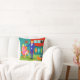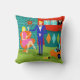 This Retro Martini Couple Throw Pillow looks like a scene out of a romantic comedy. The setting of this 1960's style, minimalist art design is an elegantly decorated, mid century modern house or apartment. The cast is an attractive couple enjoying an evening filled with sparkling conversation, good music and bottomless drinks. The room features a green floor, and an aqua and teal brick wall. Resting comfortably in a mod, orange egg chair is a beautiful woman. Her bright pink dress is just short enough to show off her shapely gams. With the wave of a hand, this blonde beauty has the immediate attention of her male admirer. Her fair haired companion is wearing a blue suit, white shirt and black bow tie. In his hands, he is holding two, crystal martini glasses with floating olives. Don't worry. He's offering one to his lady friend. The pair is having such a delightful time that neither is taking notice of the hour showing on the kitschy, red, starburst clock on the brick wall behind them. On a recessed fiery red wall, there are three Classic Movie Martini Stretched Canvas Prints, also available from StrangeLittleOnion's Zazzle store (hint, hint!) Two of the prints feature turquoise backgrounds and one is on a dramatic black background. Centered beneath the prints is an elegant wet bar. The front of the teal bar has three harlequin diamonds, in shades of orange, turquoise and green. We can see the silhouettes of martini glasses resting on the counter top. Across the room, an orange ottoman is holding a blue and black, portable record player. On the floor, we see the vinyl records and a bright yellow album cover. This attractive duo is having such a delightful time that neither is taking notice of the hour showing on the kitschy, red, starburst clock on the brick wall behind them. The opposite side of this fabulous throw pillow features a teal and aqua brick background.