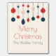 Cute retro Merry Christmas party drink mix packets with vintage 70 style ornaments in red, blue, and ivory above your family name. Beautiful nostalgic holiday party favors.