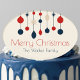Cute retro Merry Christmas party cake topper with vintage 70 style ornaments in red, blue, and ivory above your family name. Beautiful nostalgic decor.