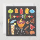 Here's a retro cool vibe to a barbecue party! Super fun BBQ with lanterns, shiskabob, drinks, tiki torch and grilling food items on a black background. Hand drawn illustration by McBooboo.