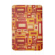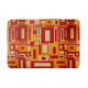 The Retro Mid Century Modern Geometrics bath mat features a geometric pattern of rectangles and squares with a crackle texture. The colors are red, golden yellow, ochre and ivory.