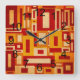 The Retro Mid Century Modern Geometrics square wall clock features a geometric pattern of rectangles and squares with a crackle texture. The colors are red, golden yellow, ochre and ivory.