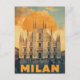 This stylish card features a vintage-style illustration of the iconic Milan Cathedral (Duomo di Milano). The design captures the grandeur of the gothic architecture, silhouetted against a bold, golden sun and a dramatic cloudy sky. The retro color palette and chunky "MILAN" typography give it a fun, nostalgic travel poster feel. Perfect for a note from Italy or for anyone who loves travel and art.