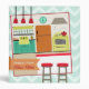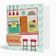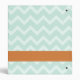 A recipe binder featuring a light blue background with light zigzags covering entire outside surface. Front features an illustration of a retro modern kitchen featuring a farm sink with cabinets, a window, a refrigerator, a stove, and a counter with two stools. Personalize with your name over orange ribbon that extends over spine and back. Spine text is also customizable.