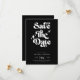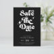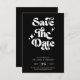 This retro modern wedding save the date card combines vintage charm with modern flair. Featuring bold, groovy script on a sleek black background, this design creates a timeless and stylish announcement for your special day. Perfect for retro-inspired weddings, it sets the tone for a chic and memorable celebration.