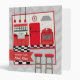A recipe binder featuring a light gray background with light zigzags covering entire outside surface. Front features an illustration of a retro modern red kitchen featuring a farm sink with cabinets, a window, a refrigerator, a stove, and a counter with two stools. Floor is black and white. Personalize with your name over red ribbon that extends over spine and back. Spine text is also customizable.