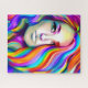 Puzzle in a semi abstract, mid-century modern inspired, portrait of a woman with long, flowing, rainbow hair in vivid primary colors