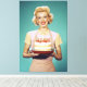 A cheerful mother with a 1950s vintage aesthetic, wearing a polka-dotted blouse and apron, smiles brightly while holding a beautifully decorated cake topped with strawberries and candles. The vibrant teal background enhances the retro vibe, evoking nostalgia and warmth. Perfect for themes of baking, motherhood, celebration, and retro style.