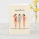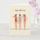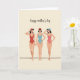 This card shows three stylized women standing close together on a soft cream background, their relaxed poses suggesting an easy bond and shared laughter ❤️. The left figure wears a red one-piece with white polka dots and a matching cap tipped as if she’s adjusting it mid-moment. In the middle, a woman in a sky-blue one-piece stands with hands on hips, topped with a red cap that adds a confident accent. On the right, a woman in a blush-pink one-piece pairs it with a light blue cap, echoing the group’s gentle, supportive energy 🌼. The figures are drawn with simple shapes and smooth lines, giving them a retro beach-day look without extra clutter. Near the top, the words “happy mother’s day” appear in a cursive, handwritten-style line in a dark ink, centered above the trio. A thin horizontal line near the bottom grounds their bare feet against the open space.