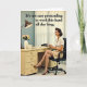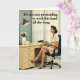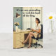 Designed with a retro office scene, the card shows a woman seated at a desk in a dark chair, turned slightly as she looks to the right with a knowing smile ❤️. She wears a cream blouse and a textured skirt, and her relaxed pose feels like a private joke shared with a close friend. One leg crosses over the other, and her heeled foot hooks onto a desk drawer handle in a cheeky, flirtatious way. Across the image, the main line of text sits prominently in light lettering and reads, “It’s not easy pretending to work this hard all day long.” The desk on the left is a soft buttery yellow, topped with a bronze-toned lamp casting a warm glow, a vase holding pink and yellow flowers 🌼, and a small bowl. To the right, sheer curtains let in gentle daylight, while a muted teal wall fills the left background. The overall scene is softly lit, with warm highlights on the lamp and flowers and cool tones along the wall and curtains.