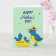 This card features a retro-style illustration on a muted mint green background, with a friendly message placed across the top in a flowing dark ink and dotted with small red hearts ❤️. Below the text, three stylized birds create a sweet family scene that reads like a quiet moment of closeness. On the right stands a larger bird wearing a yellow brimmed hat topped with a red flower, angled as if keeping a gentle, caring watch. To the left, two smaller birds sit snugly inside a golden woven basket, their faces tilted upward toward the larger bird in a tender, admiring way. The main colors lean toward soft blue and sunlit yellow, giving the scene a calm, cheerful look with a touch of romance in the way the birds seem to “talk” through their gaze. Fine texture lines add depth to the basket weave and give the background a lightly creased paper feel, like a keepsake pulled from a drawer. The basket shows tight crosshatch weaving in warm gold tones, with the two small birds tucked close together beneath the larger bird’s watchful stance 🌼.