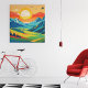 Vibrant mountain sunrise poster featuring bold modern illustration style with rich warm tones of golden sun, red peaks, and deep blue alpine ranges. This contemporary landscape wall art brings a sense of freedom and adventure, perfect for living room, bedroom, office, or gift décor. High-quality nature poster for travelers and outdoor lovers who appreciate minimalist graphic design and colorful scenic artwork.