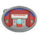 The stars are out in full force on this Retro Movie Theater Belt Buckle--both the stars in the night sky and the stars on the silver screen. This 1960's style, minimalist art design features the exterior of a classic movie house from the Golden Age of Cinema. The red building has a brilliantly lit marquee, which says, "NOW SHOWING," in red letters. Beneath the marquee, a theater employee is ready for a crowd of movie going film buffs, who are sure to be lining up in droves. The silhouette of the clean cut, theater worker is just visible through the aqua glass of the box office ticket booth. Not a kernel of popcorn can be found on the spotless grey sidewalk. Grey double doors flank the ticket booth. The front of the building displays black and white movie posters surrounded by dramatically lit frames. One poster shows star crossed lovers in a dramatic scene and the other shows a swimsuit clad starlet whose career is as bright as the sun she worships. This product is from the brilliant minds at Zazzle's StrangeLittleOnion, who have brought you such cult classics as Retro Pool Party, Film Noir Martini and Retro Space Age Cartoon Couple. Critics agree; if you can only purchase one design this season, make it this one (or any of the other spectacular StrangeLittleOnion designs)!