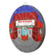 The stars are out in full force on this Retro Movie Theater Dart Board--both the stars in the night sky and the stars on the silver screen. This 1960's style, minimalist art design features the exterior of a classic movie house from the Golden Age of Cinema. The red building has a brilliantly lit marquee, which says, "NOW SHOWING," in red letters. Beneath the marquee, a theater employee is ready for a crowd of movie going film buffs, which are sure to be lining up in droves. The silhouette of the clean cut, theater worker is just visible through the aqua glass of the box office ticket booth. Not a kernel of popcorn can be found on the spotless grey sidewalk. Grey double doors flank the ticket booth. The front of the building displays black and white movie posters surrounded by dramatically lit frames. One poster shows star crossed lovers in a dramatic scene and the other shows a swimsuit clad starlet whose career is as bright as the sun she worships. This product is from the brilliant minds at Zazzle's StrangeLittleOnion, who have brought you such cult classics as Retro Pool Party, Film Noir Martini and Retro Space Age Cartoon Couple. Critics agree; if you can only purchase one design this season, make it this one (or any of the other spectacular StrangeLittleOnion designs)!