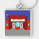 The stars are out in full force on this Retro Movie Theater Keychain--both the stars in the night sky and the stars on the silver screen. This 1960's style, minimalist art design features the exterior of a classic movie house from the Golden Age of Cinema. The red building has a brilliantly lit marquee, which says, "NOW SHOWING," in red letters. Beneath the marquee, a theater employee is ready for a crowd of movie going film buffs, who are sure to be lining up in droves. The silhouette of the clean cut, theater worker is just visible through the aqua glass of the box office ticket booth. Not a kernel of popcorn can be found on the spotless grey sidewalk. Grey double doors flank the ticket booth. The front of the building displays black and white movie posters surrounded by dramatically lit frames. One poster shows star crossed lovers in a dramatic scene and the other shows a swimsuit clad starlet whose career is as bright as the sun she worships. This product is from the brilliant minds at Zazzle's StrangeLittleOnion, who have brought you such cult classics as Retro Pool Party, Film Noir Martini and Retro Space Age Cartoon Couple. Critics agree; if you can only purchase one design this season, make it this one (or any of the other spectacular StrangeLittleOnion designs)!