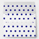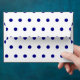 Small navy blue polka dots against a white background. You can use a rectangle these days if you'd prefer a solid color inside or outside. A nice retro design for your special event.