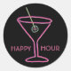 Made to look like a vintage bar sign, the retro design on this sticker features a neon pimento-stuffed olive on a toothpick floating in a pink neon martini glass. With one word on each side of the glass’ stem, the phrase “HAPPY HOUR” is spelled out in open text in the same pink. The customizable text can easily be changed to say whatever you like or can be deleted altogether. From my original digitally created image.