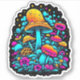 Colorful neon art with blue and pink mushrooms and flowers and a black background.