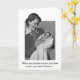A vintage illustration from an advertisement features a retro mid-20th century new mother holding and smiling at her new baby. She beams with pride as she holds the baby so that others can admire it. The front of the card says, "When you become a mom, you have to give up certain luxuries..." and inside the card, "...…like sleep, food and showers."