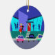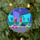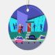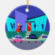 This customizable Retro Open House Party Christmas Ornament will put you in the partying mood. The cartoon design features the exterior of a mid century modern house. Through the floor to ceiling turquoise glass walls, we can see the navy blue silhouettes of festive party goers. There is a couple chatting in front of a window. On the opposite side of the room, we can see a dancing man and the long-winded man everyone is trying to avoid. The exterior of the house features a cheery red door and an oversize purple brick chimney. A grey walkway is cutting a swath to the front door, through the teal grass. The nighttime scene has a dark blue sky with a yellow, crescent moon. An attractive couple is doing the cha-cha-cha on the way to their car. The blond woman is wearing a bright red dress. Her handsome escort is wearing a black suit and a red tie. His hands are wrapped around the woman's waist. On the street, in front of the house, we can see three, brightly colored classic cars. The opposite side of the ornament has plenty of room for personalizing! Order today and party like it's 1959!